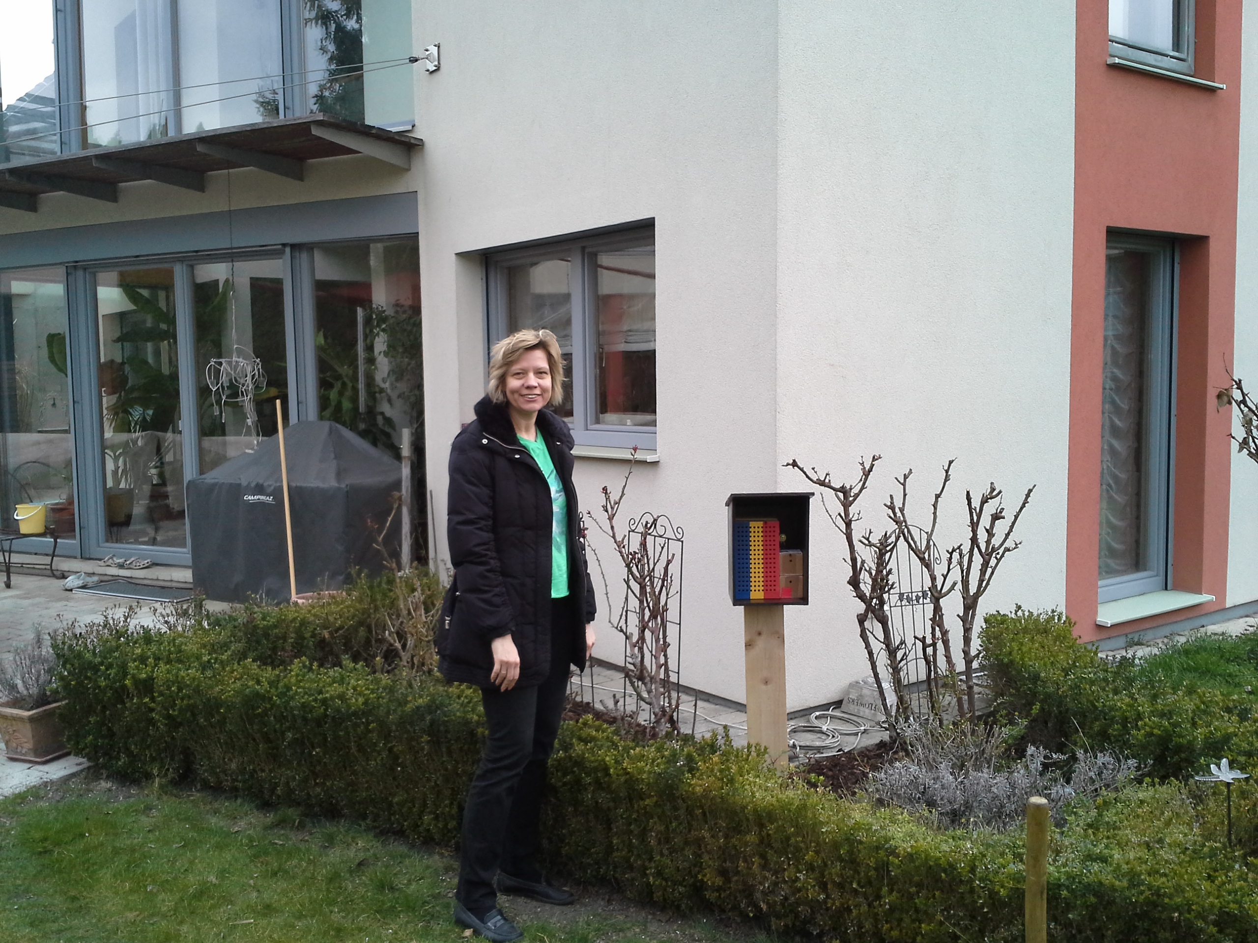 Susanne mit ihrem Wildbienenhotel